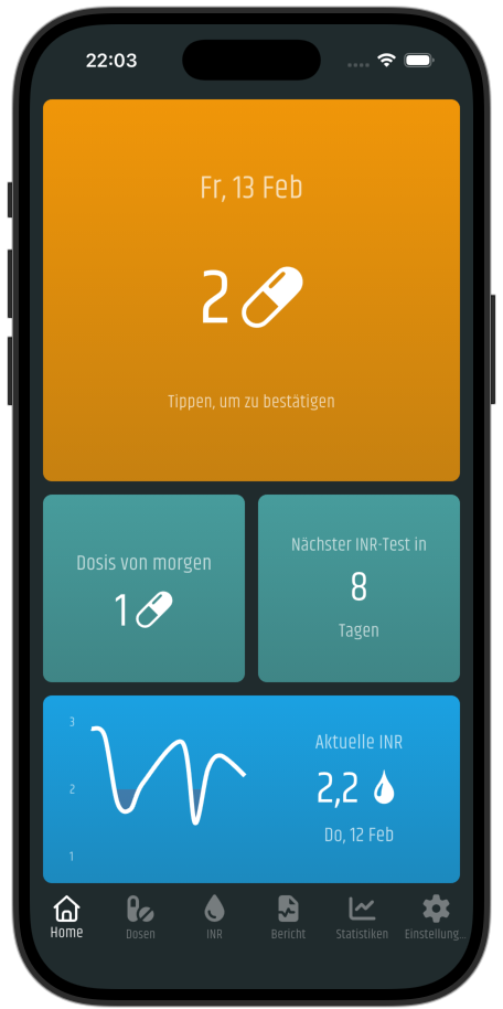 Heute ist INR Diary die am besten bewertete INR-Management-App für Android und iOS. Sie ist in sieben Sprachen verfügbar: Englisch, Deutsch, Spanisch, Katalanisch, Französisch, Italienisch und Niederländisch. Derzeit wird sie von über 10.000 Patienten, die Blutverdünner einnehmen, in mehr als 40 Ländern weltweit genutzt.